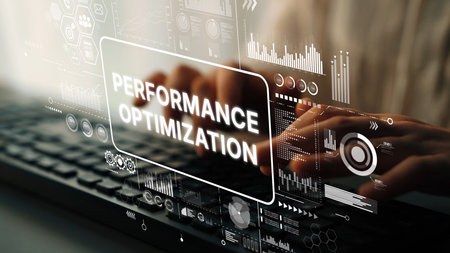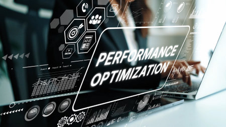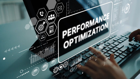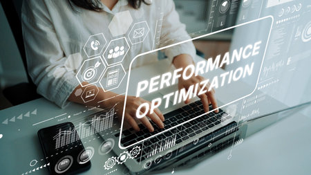 Professional working on computer with performance optimization graphics and analytics in modern office setting. Asymptotic smart data analytic.