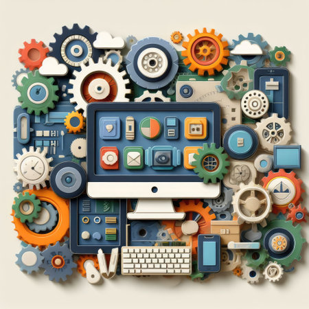 A detailed close-up of mechanical gears and colorful blocks arranged on a circuit board, creating a futuristic and technological mood.