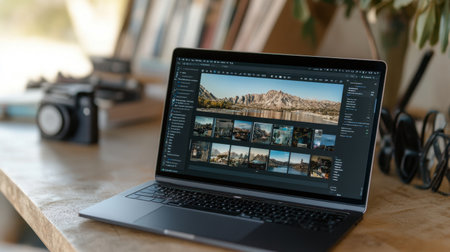 A laptop screen showcases video editing software, situated on a desk cluttered with various objects. The scene exhibits a shallow depth of field, with soft lighting and a bokeh effect. This image could be suitable for illustrating technology, media production, or creative workflows in various commercial contexts.