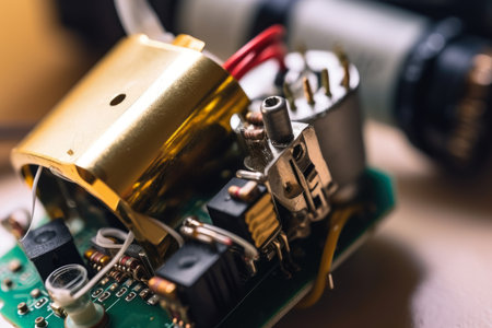 This close-up image depicts an electronic circuit board with various capacitors and resistors, showcasing intricate details of modern technology and engineering design.