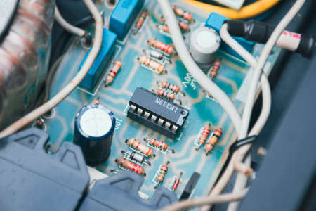 Vintage electronic circuit boards with radio parts and chips, close-up, macro photography