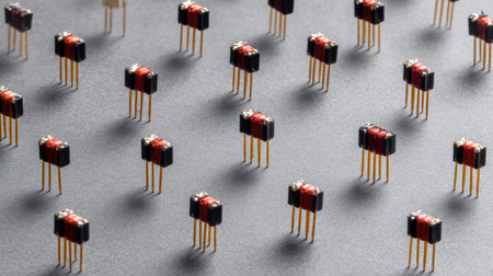 This image features an array of electronic components resembling resistors, meticulously arranged on a dark surface, showcasing modern technology.
