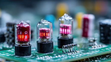 This image showcases vintage vacuum tubes on a circuit board, emphasizing intricate details and colorful glow, perfect for technology and design enthusiasts.