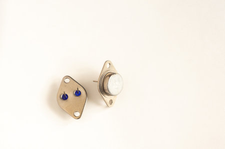 Power transistor is a component electronic devices, NPN and PNP, metal body on white background isolated