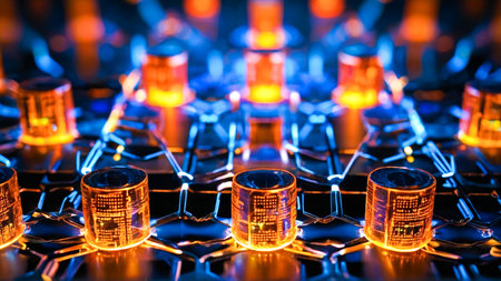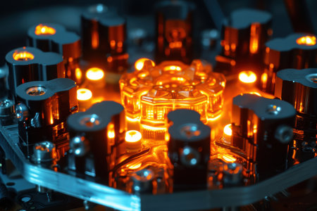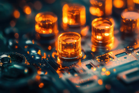 Close Up of Circuit Board With Multiple Lights, Nano-transistors on a microchip, AI Generated
