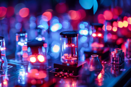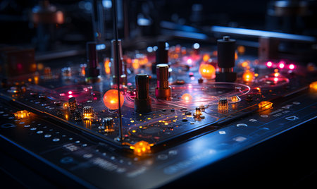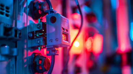 An electronic circuit board and various components are showcased, illuminated by a combination of red and blue light. The image highlights a complex arrangement of wires, panels, and equipment, indicating a possible laboratory or workshop setting. This composition may be suitable for illustrating technology, innovation, or research concepts in commercial contexts.