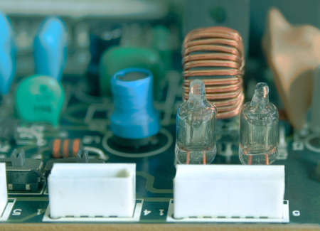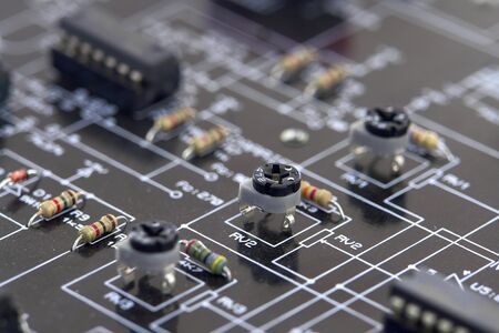Closeup electronic hardware .Resistor and condensers assembly on the circuit board