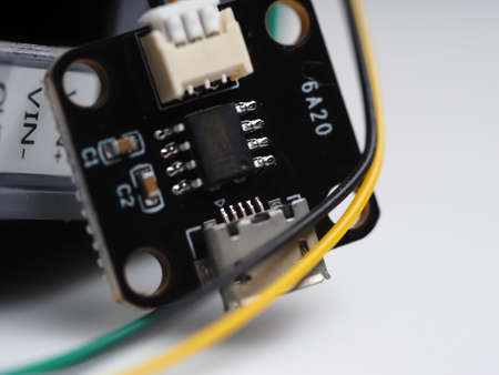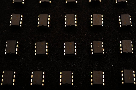 This close-up image showcases an electronic circuit board component featuring various chips and pins, illuminated by soft light. Perfect for technology themes.