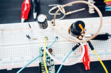 Experiment with electronic components close-up. Breadboard with wires and connectors. Students experience in laboratory.
