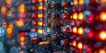 A detailed close-up image showcasing a vibrant circuit board with illuminated components. The blue and red lighting creates an abstract and futuristic atmosphere, highlighting the intricate design. Perfect for technology themes.