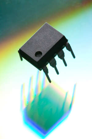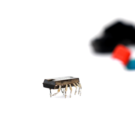 Old chips on a white background. Different electronic chips. Microcircuits in a metal case.