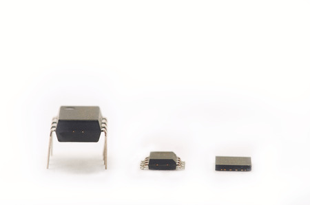 Tree microchips isolated on white background. Discrete components packaging evolution.