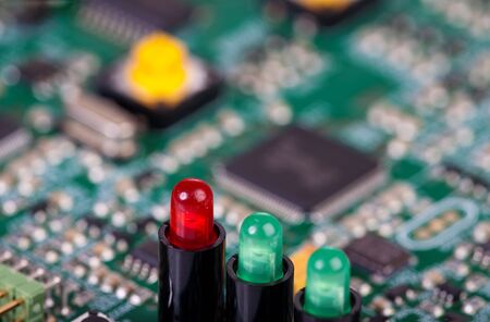 Two green and one red LED in sockets diagonally in a row on a circuit board