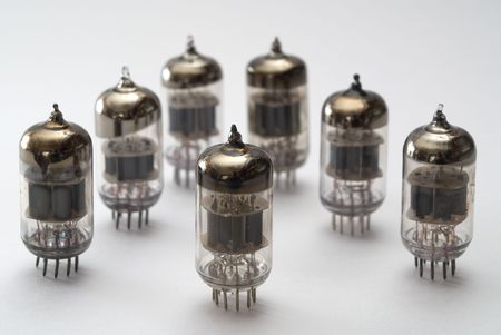 Random vacuum tubes on a black background. A group of radio tubes of different sizes and purposes. Selective focus.