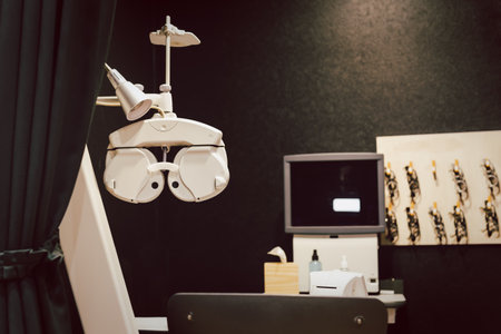 Empty ophthalmologist room with phoropter, eye test chart, trial frame and anatomical poster of the human eye, ready for eyesight exam