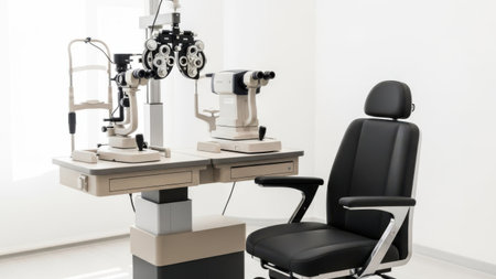 The image depicts a modern eye examination setup in a clinical environment. It features advanced ophthalmic equipment, including a phoropter and a slit lamp, mounted on a sturdy table. Adjacent to the table is a comfortable, adjustable chair designed for patients. The equipment appears to be state-of-the-art, indicating a high level of professionalism and attention to detail in the examination process. The setting is clean and well-organized, suggesting a focus on providing precise and efficient eye care.