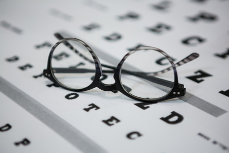 Close-up of spectacles on eye chart in ophthalmology clinic