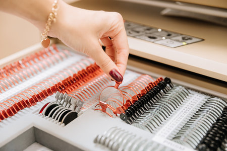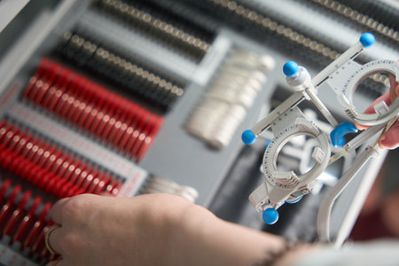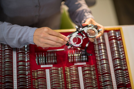 Close-up image of doctor choosing lens for trial frames