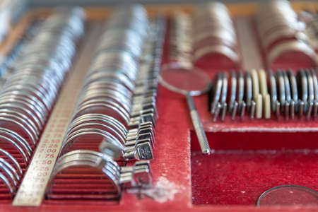 A set of lenses to check vision. A suitcase with magnite glasses. Equipment in the ophthalmologist's office. City Hospital. May, 2020, Brovary, Ukraine.