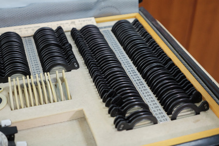 Diopter lens with lenses in ophthalmological test box. Ophthalmological messbrille and lens kit