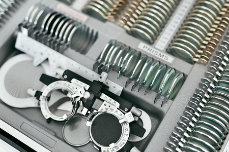 Close up view of optometrist tools and glasses to check the vision.