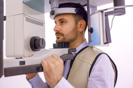 Close-up of a patient measuring the retina with Fundus Photography and Optical coherence tomography, medical technology concept.