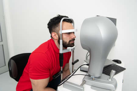 Optometrist examining the eyes of a male patient in a modern ophthalmology clinic. Eye doctor with man patient during an examination in modern clinic. Optometry concept. Eyesight exam in clinic.
