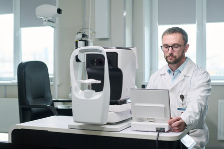 Caucasian middle aged man wearing glasses operating ophthalmology diagnostic equipment in medical office, focusing on computer screen