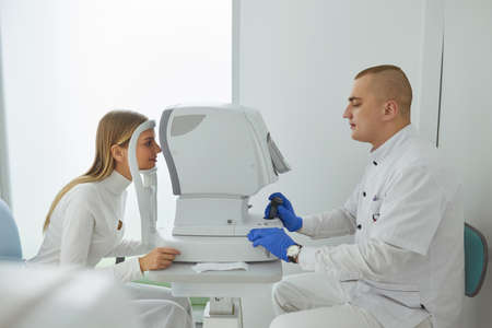 Ophthalmologist using medical equipment, appointment at the hospital