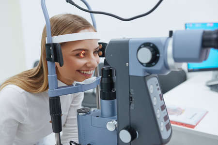 Girl is visiting ophthalmologist for eyes examination. Ophthalmology procedure with slit lamp for eye and cornea checkup