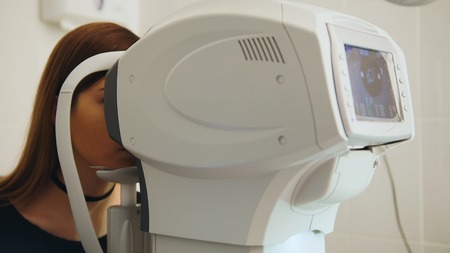 An adult girl at an ophthalmologists appointment checks her eyesight on a special apparatus. Close-up