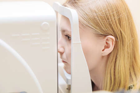 A young girl at the reception at the ophthalmologist checks her eyesight on a special apparatus. close-up.