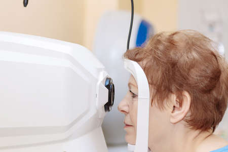 An adult woman at an ophthalmologists appointment checks her vision on a special apparatus. Close-up.