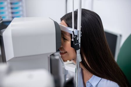 Eyesight examination. Beautiful pleasant patient smiling while visiting eye doctor and having eyesight examination