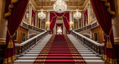 Luxury red velvet carpet on the stairs in the royal palace