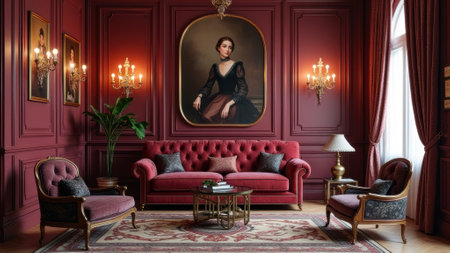 Elegant victorian living room with luxurious red decor and classic portrait. That the image is generated using AI.