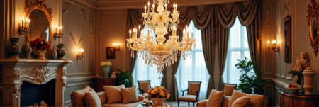 Elegant classic living room with grand chandelier in luxurious setting. That the image is generated using AI.