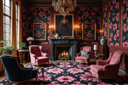 Elegant floral-themed living room with Victorian decor and fireplace. That the image is generated using AI.