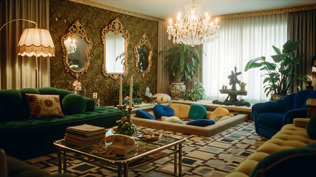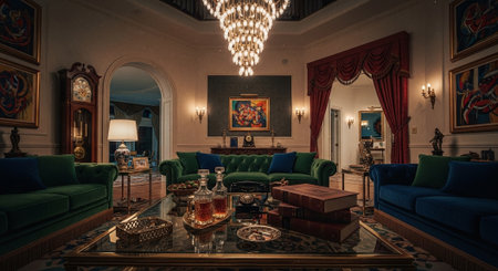 Elegant vintage living room with crystal chandelier and classic decor. That the image is generated using AI.