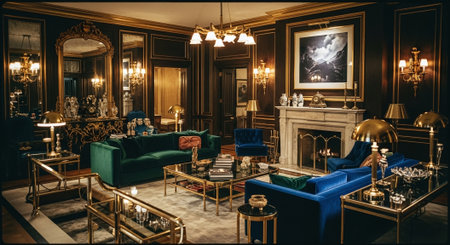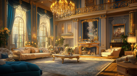 rich apartment interior with golden baroque decorations on the walls and luxury furniture. the room is flooded with the rays of the setting sun