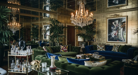 Living room decor, home interior design . Art Deco Glam style with Chandelier decorated with Velvet and Glass material . Generative AI AIG26.