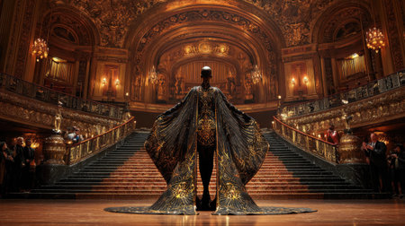 A stunning performer stands dramatically on the grand staircase of a luxurious theater, showcasing an elaborate costume that captivates the audience with its intricate design and rich textures.