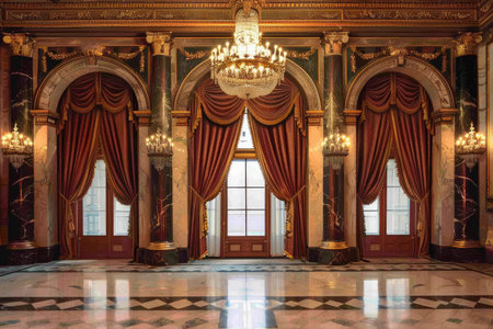 Grand Entrance Hall of a Classic Theater with Red Carpet and Chandeliers