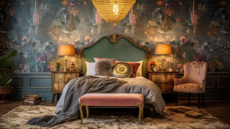 Bedroom decor, home interior design . Art Nouveau Bohemian style with Wallpaper decorated with Brass and Velvet material . Generative AI AIG26.