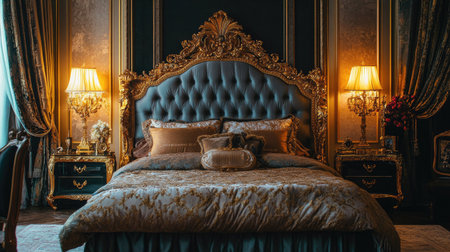 A luxury bedroom featuring a large, comfortable bed with an ornate headboard, golden accents, and soft lighting.