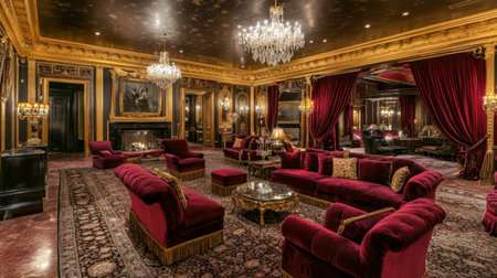 Experience the opulence of a vintage living room adorned with rich red velvet, ornate furniture, and stunning chandeliers, perfect for luxurious gatherings.