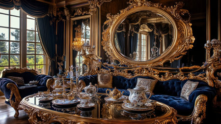A princess living room design with a large oval mirror, a gold-trimmed sofa, and a beautiful tea set on the table.