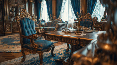 Experience the luxury and sophistication of this elegantly designed living room featuring exquisite blue velvet chairs and detailed woodwork in a timeless and inviting atmosphere.