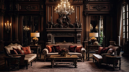 This image showcases a luxurious vintage couch in a sophisticated gothic interior, featuring exquisite details and a rich, dark color palette that enhances elegance.