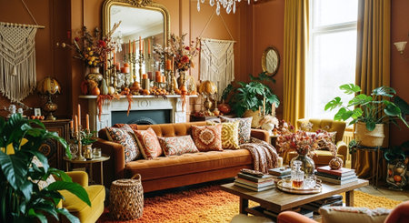 A stylish living room featuring a chandelier, elegant furniture, and lush plants, with warm autumn colors and decorative elements